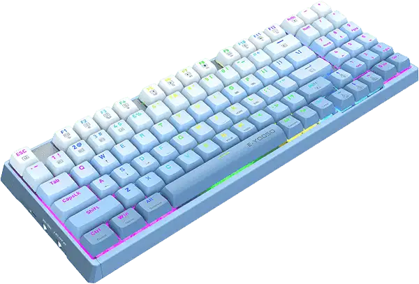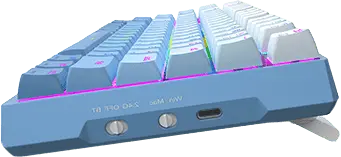 Taustiņu vāciņiem ir smalka balti-zila krāsu pāreja (fading white/blue), kas piešķir tastatūrai īpašu maigumu un vizuālu vieglumu. Korpusa augšdaļa un apakšdaļa ir izgatavota no ABS plastmasas, tāpēc tastatūra ir viegla, bet vienlaikus izturīga un ērta ikdienas lietošanai.